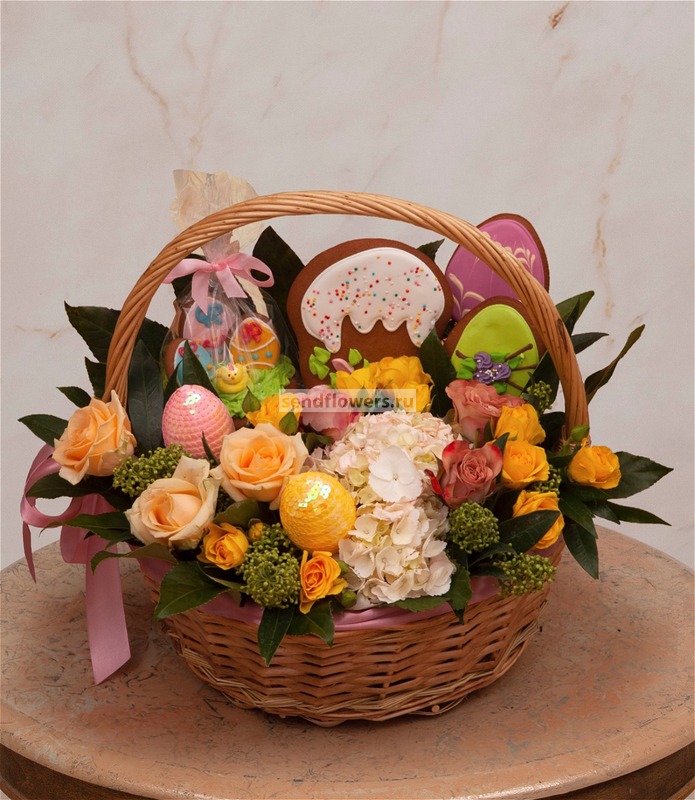 Состав: Аралия (4), Оазис кирпич (2), Корзина малая (1), Лента натуральная (5), Роза кремовая (3), Роза кустовая желтая (3), Скиммия зеленая (2), Яйца на вставке (2), Роза Каппучино (3), Гортензия розовая CO (1), Пряник "Яйцо" на палочке (2), Пасхальная пряничная композиция (1), Пряник "Пасхальный кулич" (1)